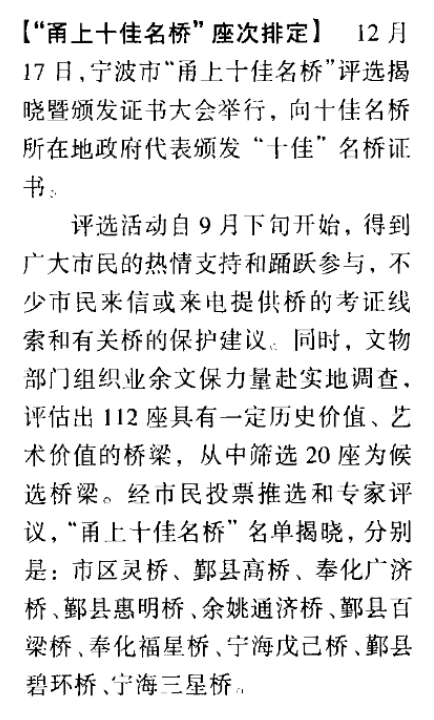 Template:Vd疑似1998年12月17日“甬上十佳名桥”评选。没找到完整介绍来源,报纸上应该有。提及不少,但感觉不适合作为分类。类似的,2008年宁波百桥评选,但找不到来源。--YFdyh000(留言) 2024年11月28日 (四) 10:56 (UTC)- Template:倾向保留: